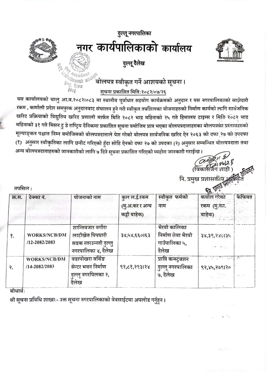 बाेलपत्र स्वीकृत गर्ने आशयकाे सूचना