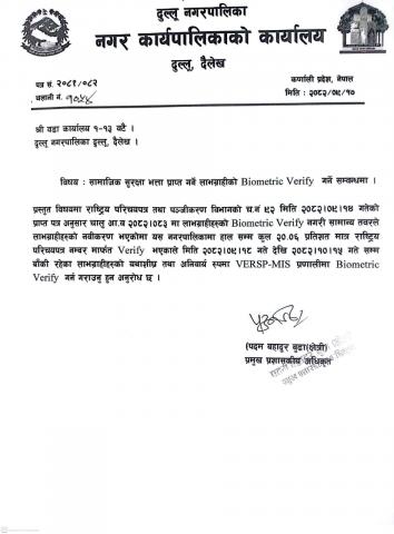 » सामाजिक सुरक्षा भत्ता प्राप्त गर्ने लाभग्राही काे Biometric verify गर्ने सम्बन्धमा