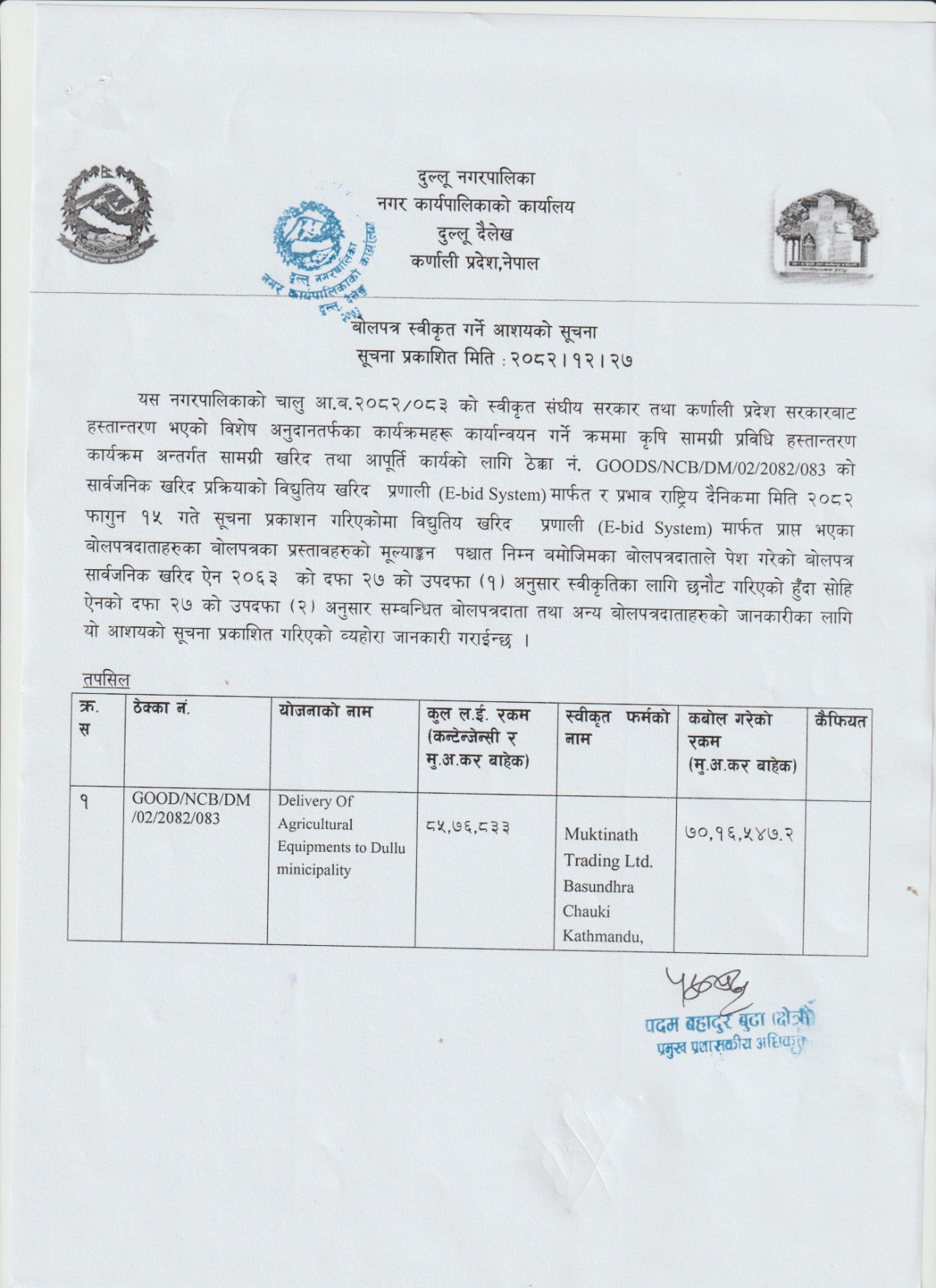 वोलपत्र स्वीकृत गर्ने आशयको सूचना