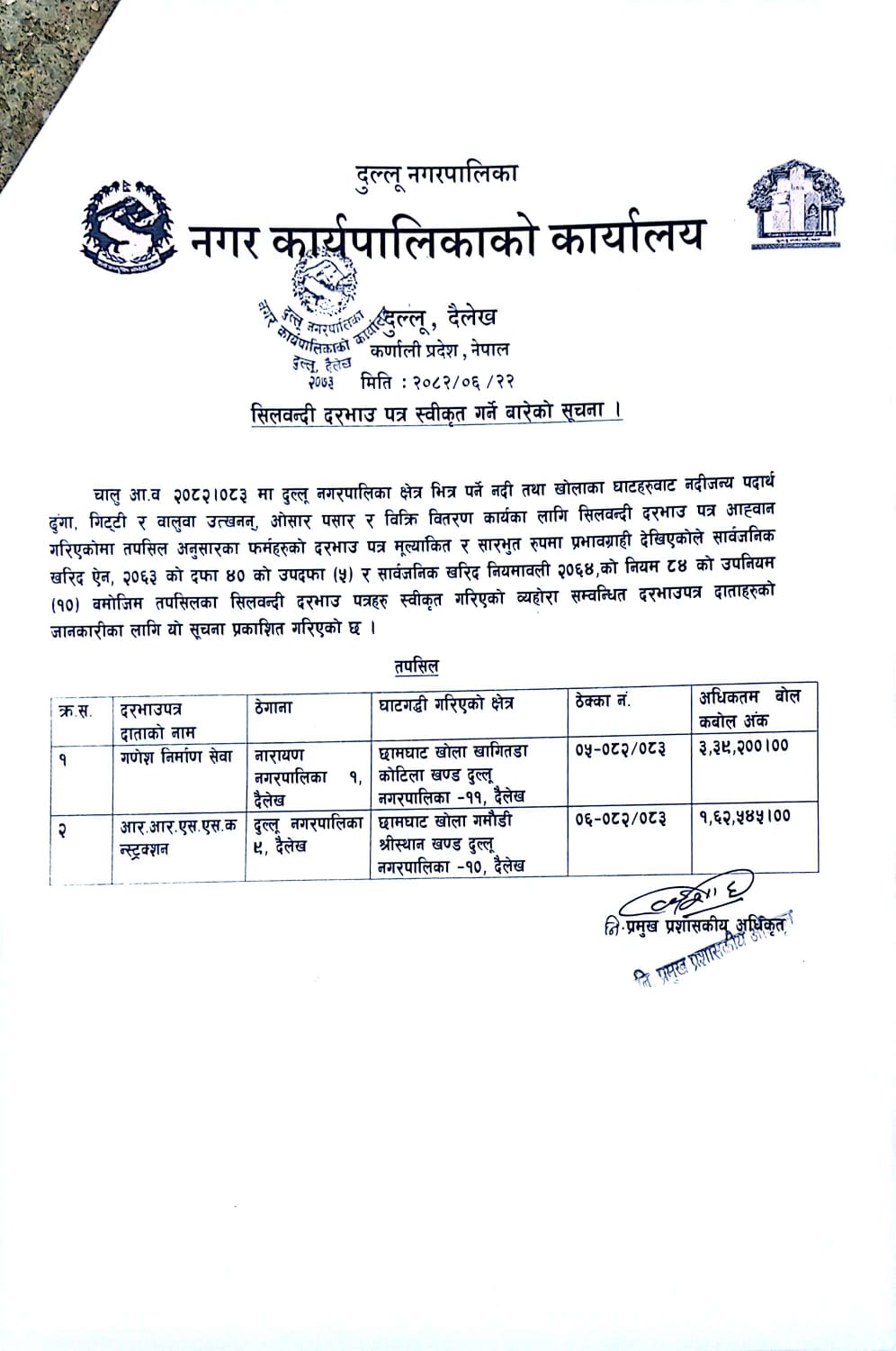 सिलबन्दी दरभाउपत्र स्वीकृत गर्ने वारेको सूचना